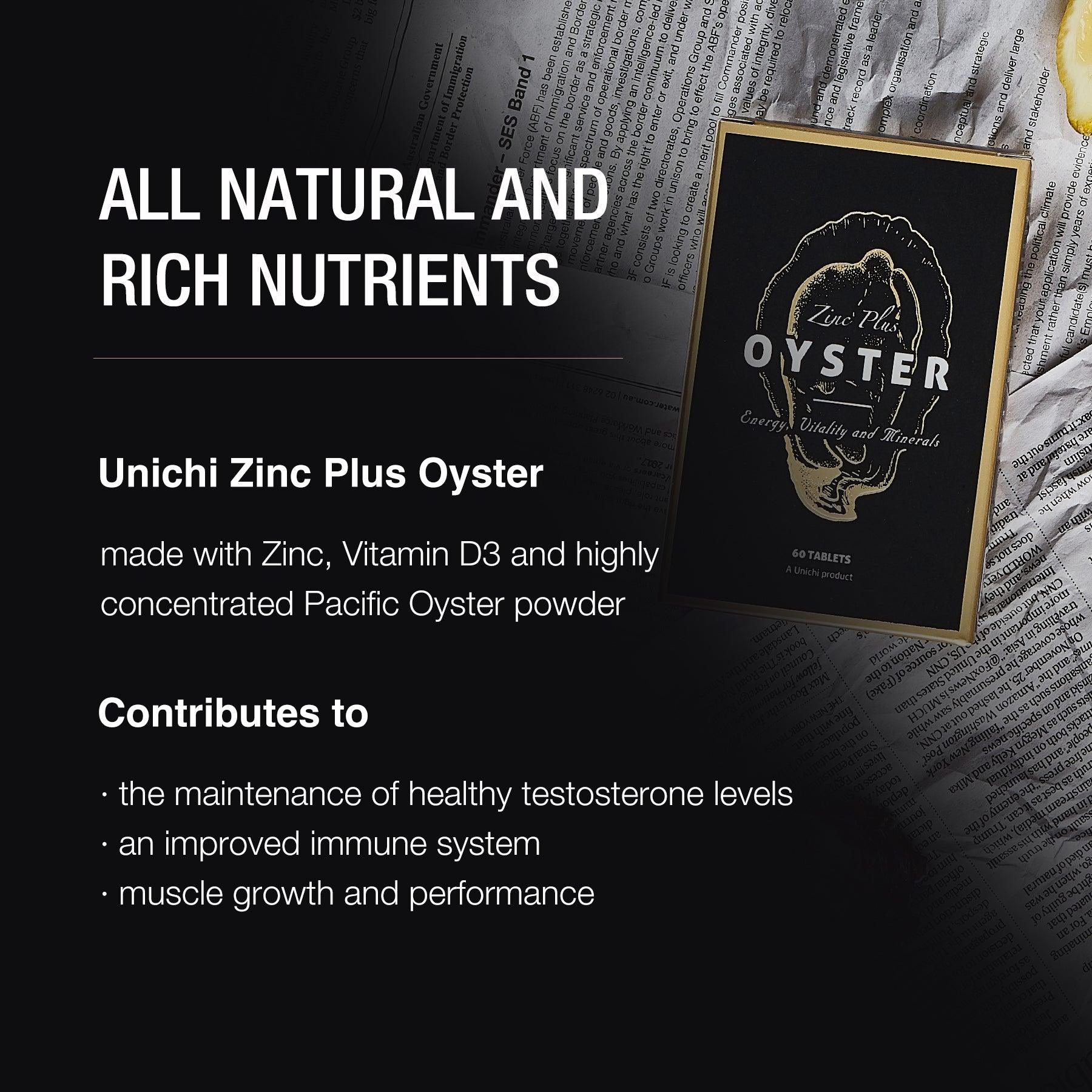 Oyster Supplement by Unichi supports reproductive health, supports muscle development, and supports a healthy immune system. It has a multi-nutritive supplement formulated with naturally derived zinc โ an essential trace element required for normal fertility, healthy testosterone production and immunity maintenance.
